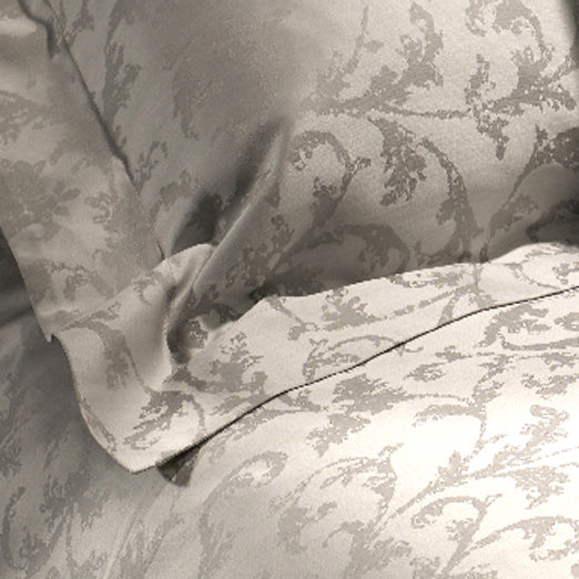 Nessun dettaglio è mai lo stesso nel motivo Jacquard delle federe Auriga. Il morbido, lucido cotone tinto in filo, le tonalità cangianti del grigio e il sapiente intreccio pittorico che gioca con i chiari e gli scuri muovono le foglie del disegno creando paesaggi sempre nuovi. Immersive.