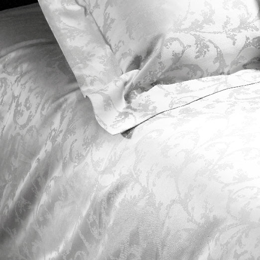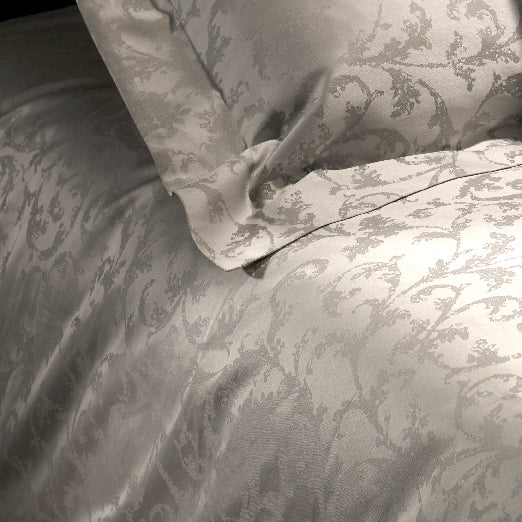 Basta accendere una luce soffusa la sera o aprire le finestre e fare entrare la luce del mattino oltre le tende perché il completo Auriga prenda vita. Il raffinato motivo Jacquard gioca con le diverse scale di grigio dell’intreccio per dipingere una natura in movimento, che cambia, tono su tono, con il cambiare dei riflessi sul tessuto. Resi ancora più lucidi e avvolgenti dal lavoro di finitura sul miglior cotone pregiato, il copripiumino e le federe Auriga vi portano in un altro mondo. Come in un sogno, che non è mai lo stesso.